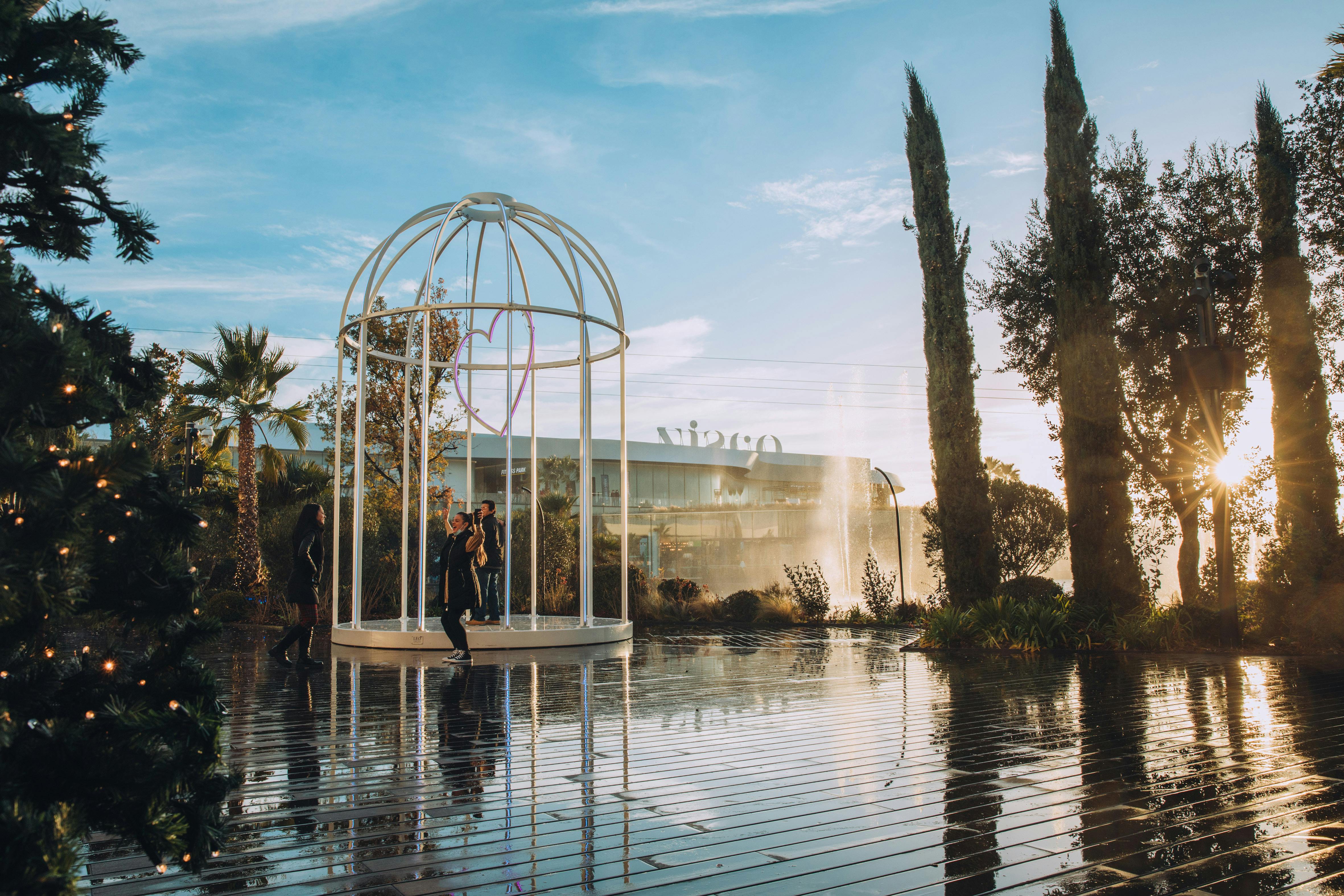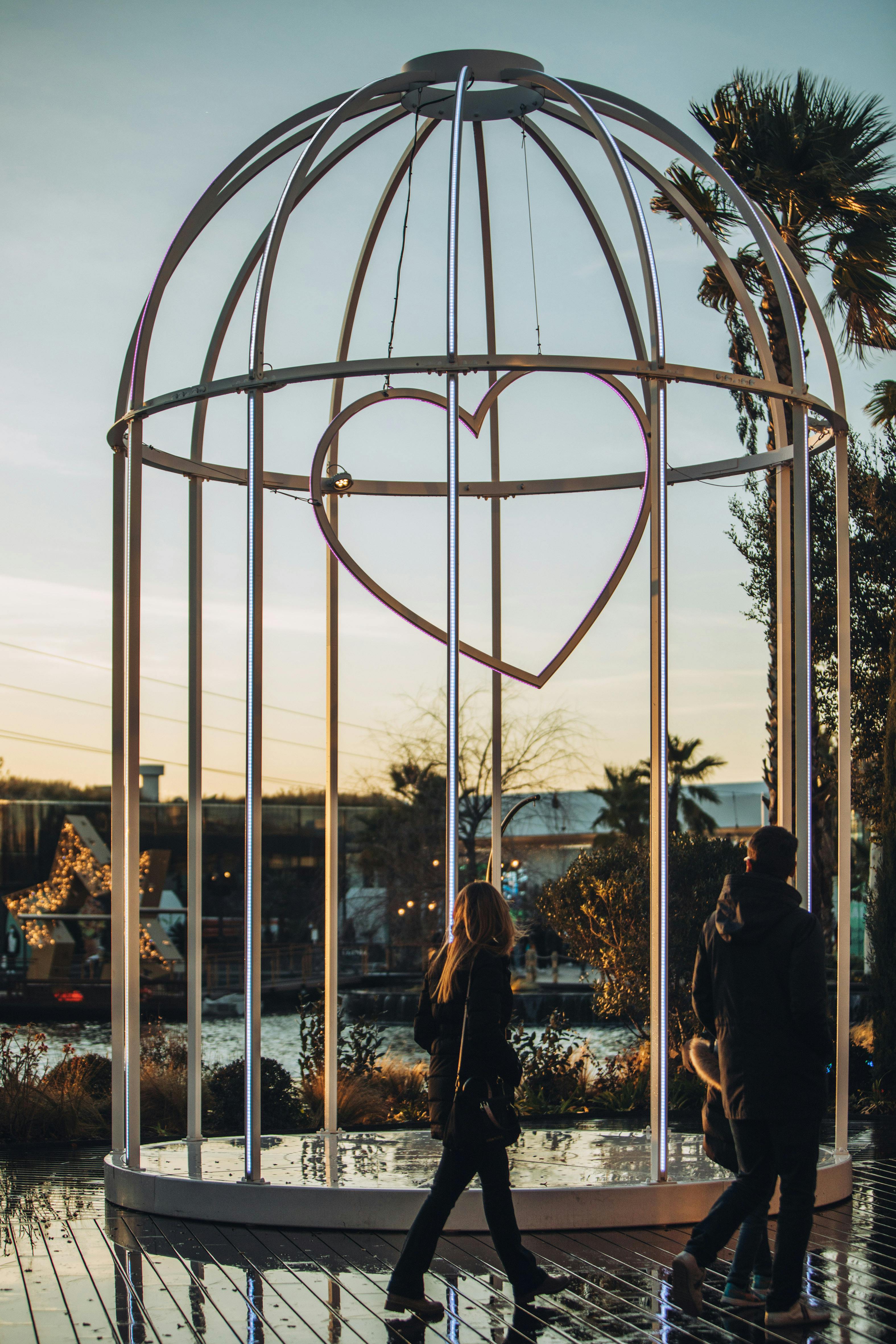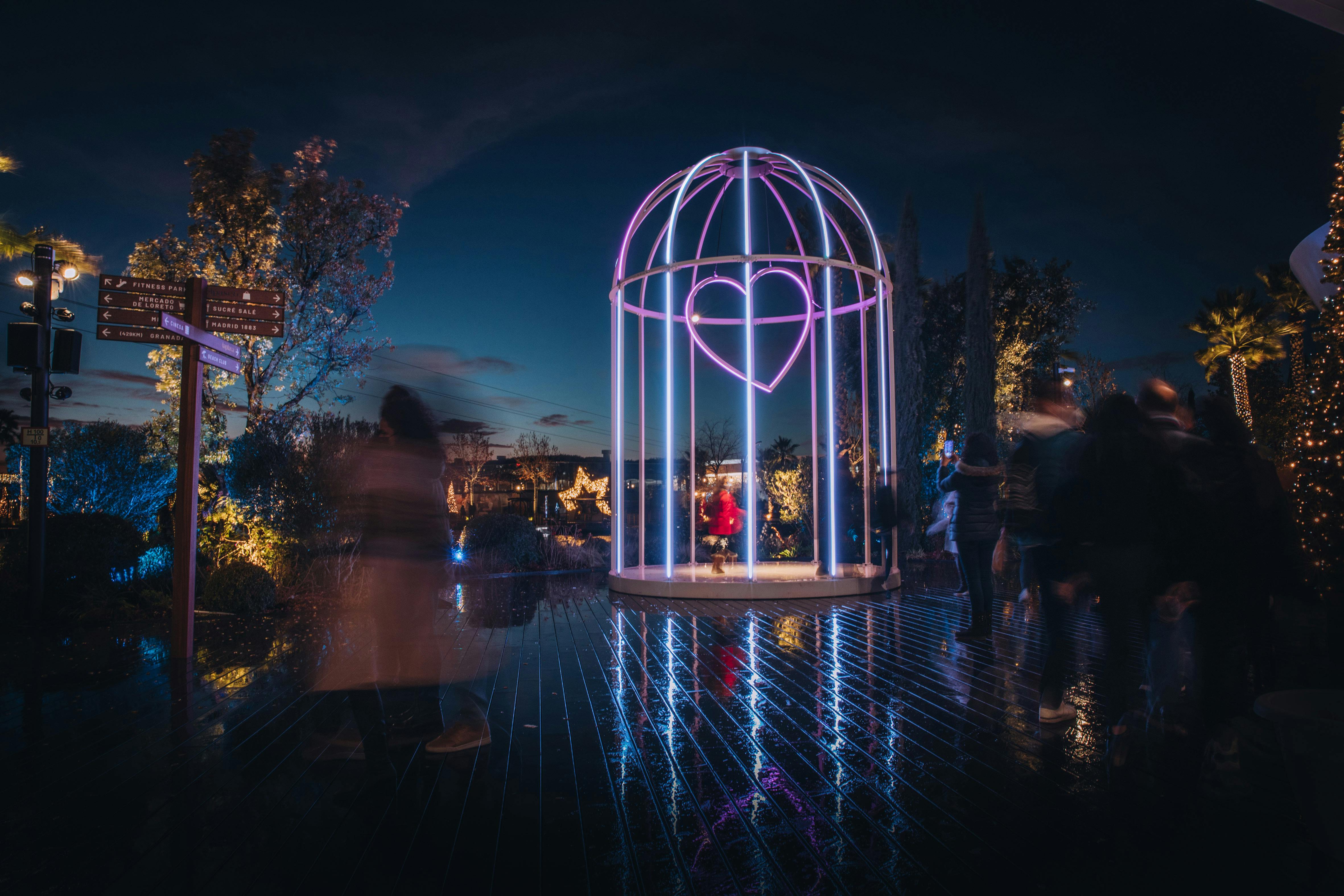 L’arc en ciel lumineux, l’habillant de nuit, évoquait cette cage qui flottait aux vents, et laissant passer l’oiseau librement, lorsqu’elle était suspendue entre ciel et terre, pour venir capturer le temps d’instants de partage, le passant, profitant du kiosque urbain.