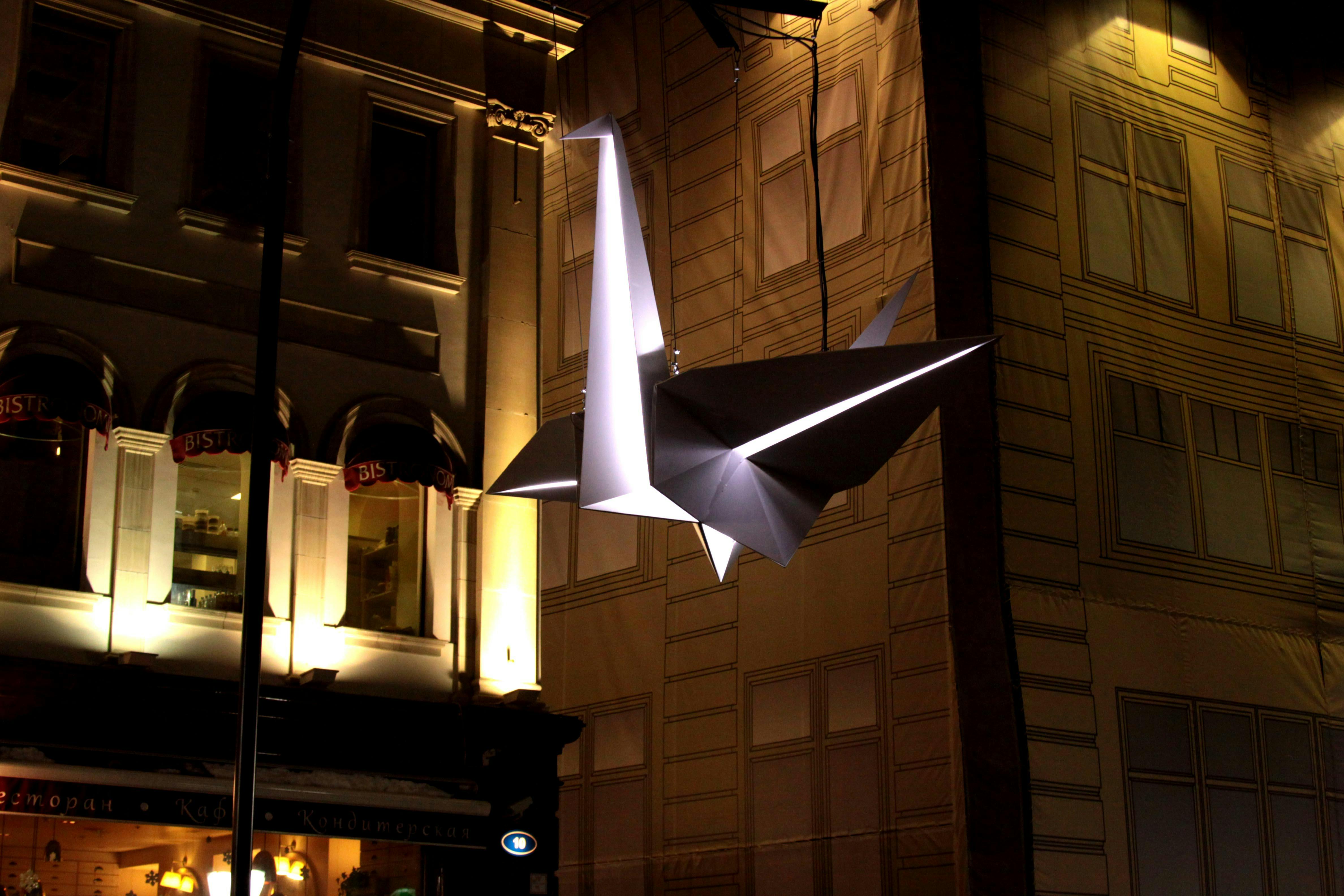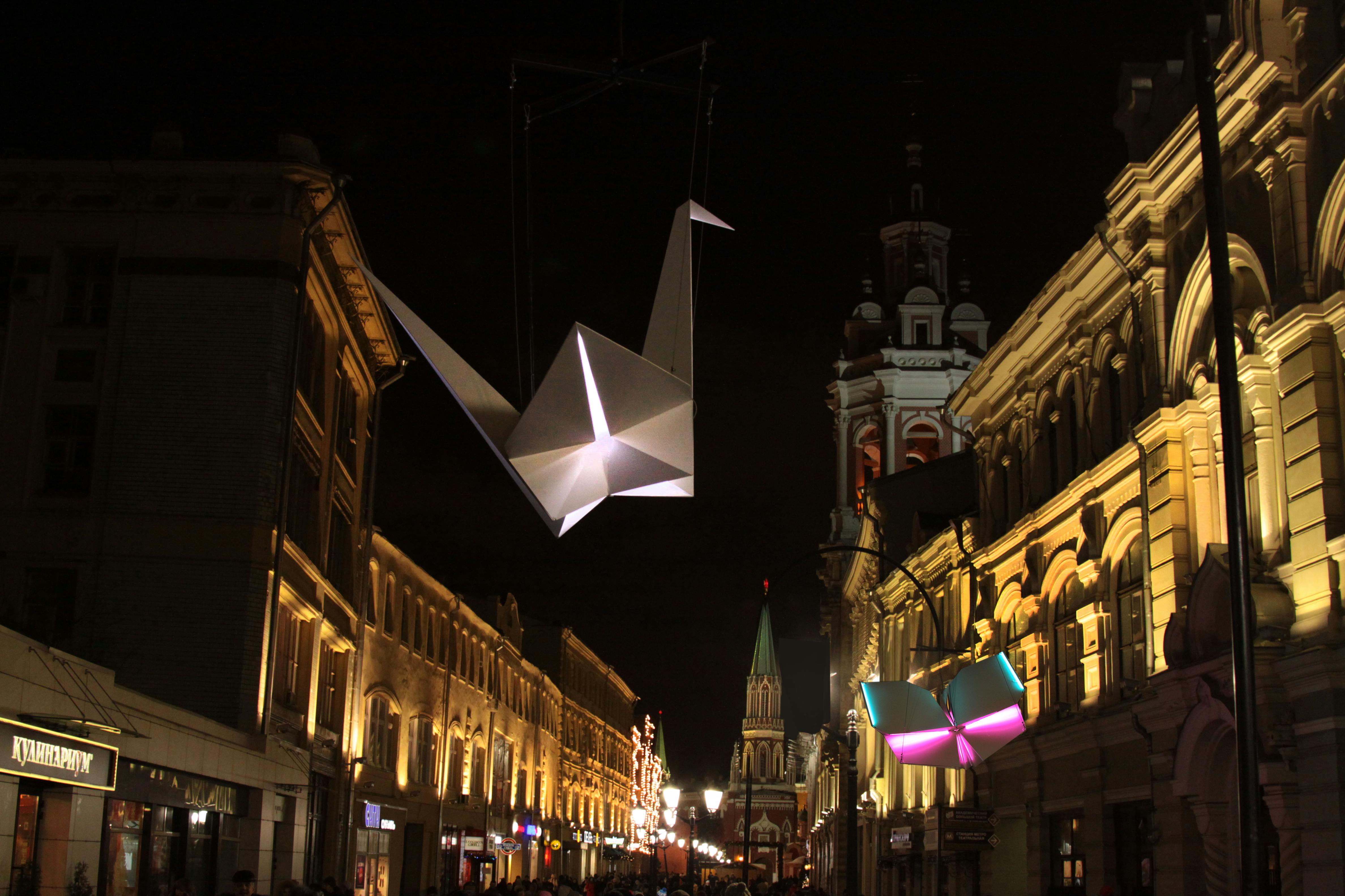 12 pièces d’art origamis comme pièce pliée en métal en référence à l’art du papier ont été présentés à proximité de la Place Rouge à Moscou en 2014.